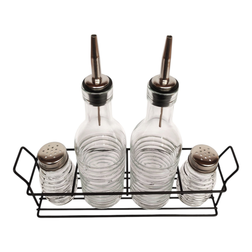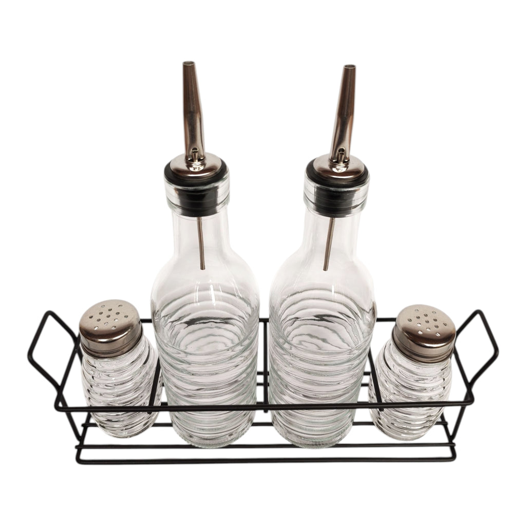 Juego de 4 piezas de vidrio tipo alcuza. Incluye envases para aceite, vinagre, sal y pimienta. Fabricados en vidrio resistente con tapas prácticas para un vertido controlado. Ideal para mantener condimentos organizados en la mesa o cocina, aportando elegancia y funcionalidad al uso diario.