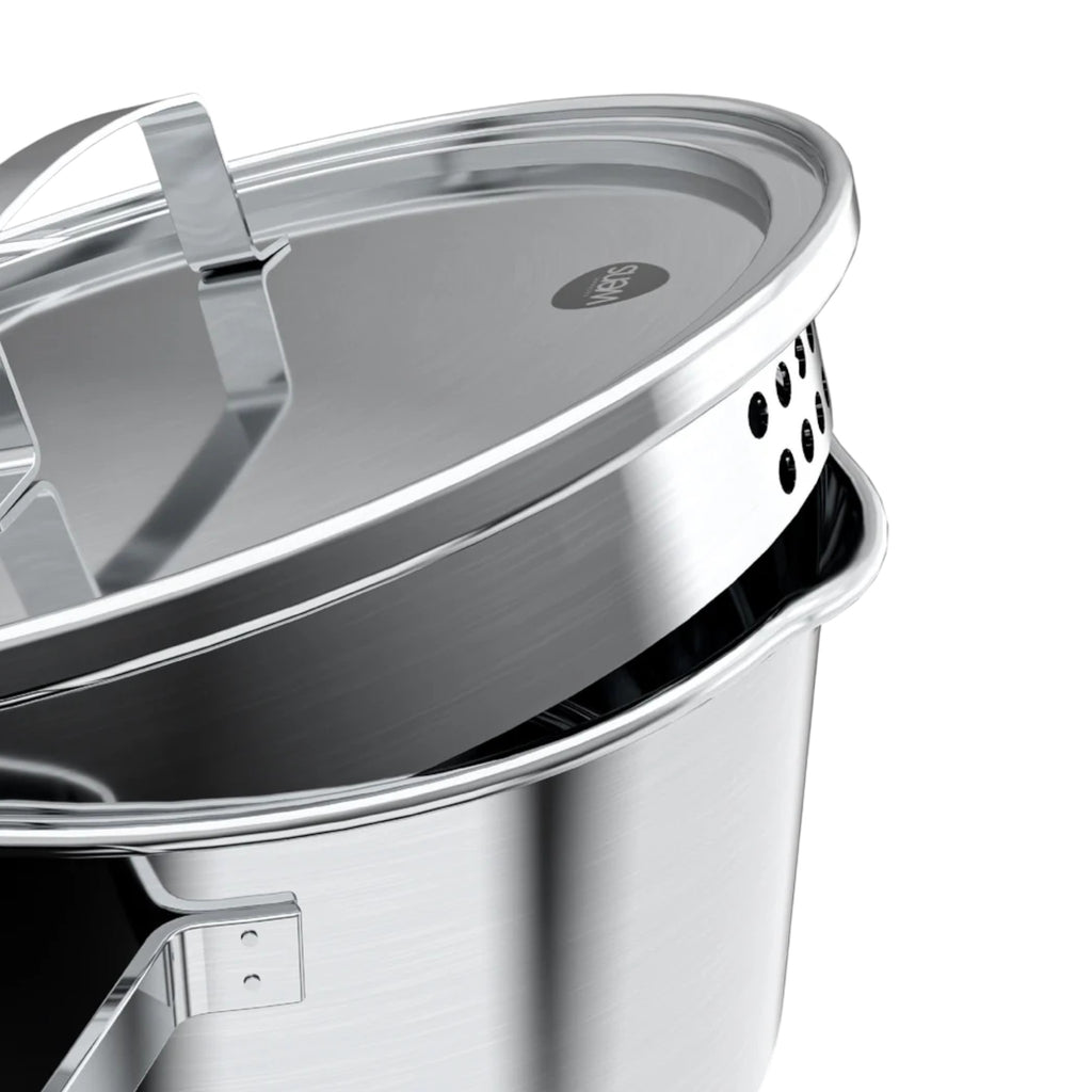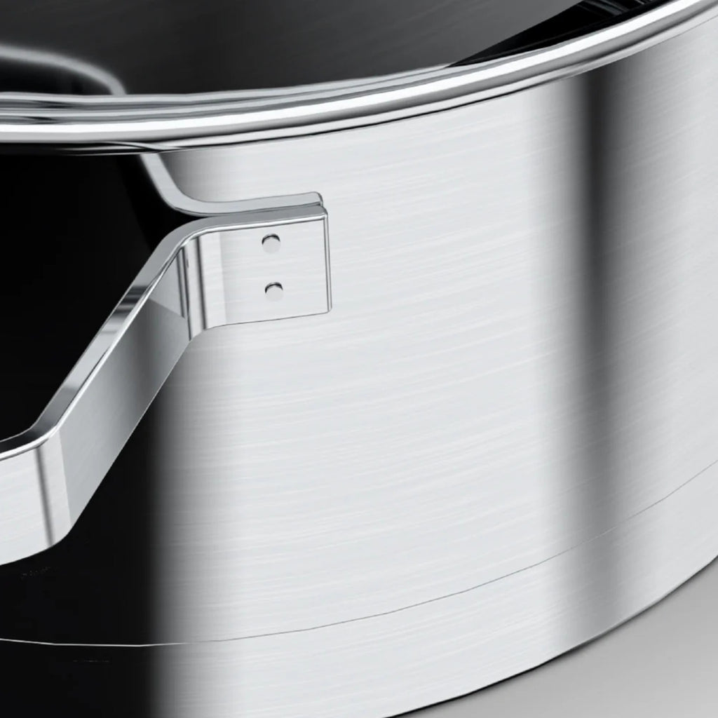 Cacerola alta de 24 cm fabricada en acero inoxidable premium, ideal para sopas, caldos o cocciones prolongadas. Su diseño alto evita derrames y permite una cocción uniforme. Resiste altas temperaturas sin deformarse y es compatible con todo tipo de cocinas, incluida la de inducción. Su acabado pulido realza su estética y facilita su mantenimiento.