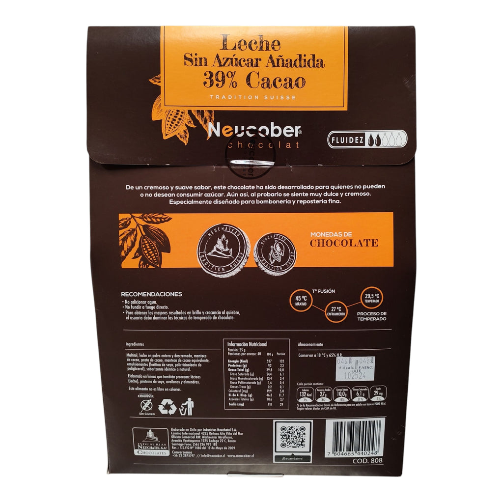 Cobertura de chocolate con leche sin azúcar añadida. Ideal para postres bajos en azúcar sin sacrificar sabor. Se funde de manera uniforme y es apta para moldeado, rellenos y baños.