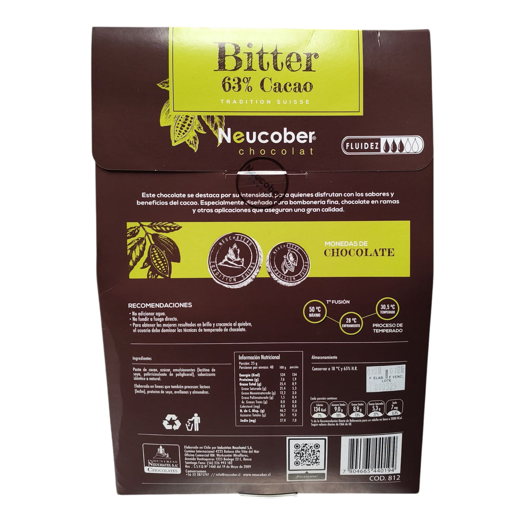 Cobertura de chocolate bitter 63% cacao, en presentación de moneda. Sabor equilibrado, ideal para postres gourmet, bombones y preparaciones exigentes. Se funde fácilmente y ofrece un acabado brillante.
