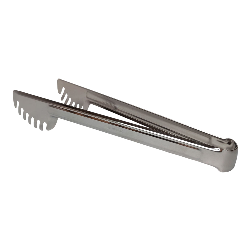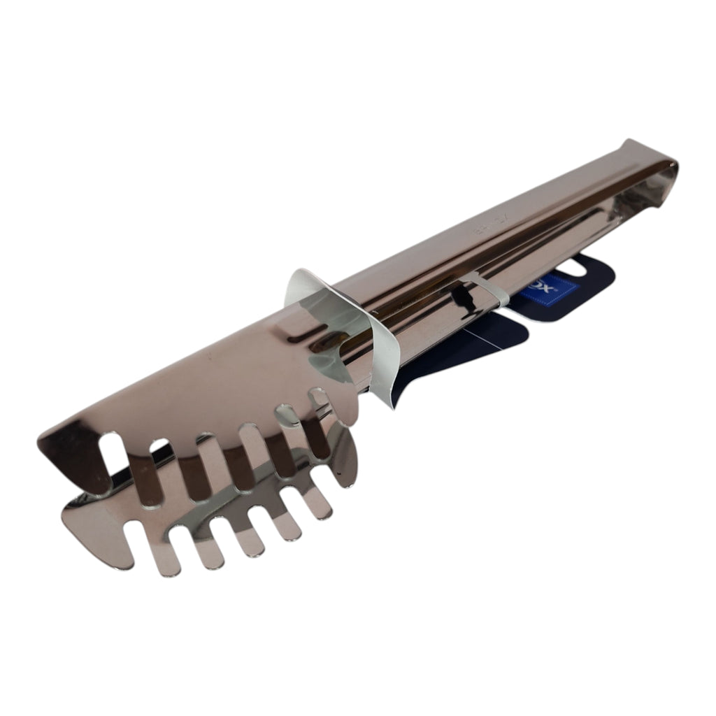 Pinza para pastas en acero inoxidable de 28 cm. Su diseño con bordes ranurados facilita sujetar espaguetis, tallarines u otras pastas largas sin que se deslicen. Resistente, higiénica y duradera, es una herramienta indispensable para servir platos de pasta de manera práctica y elegante.