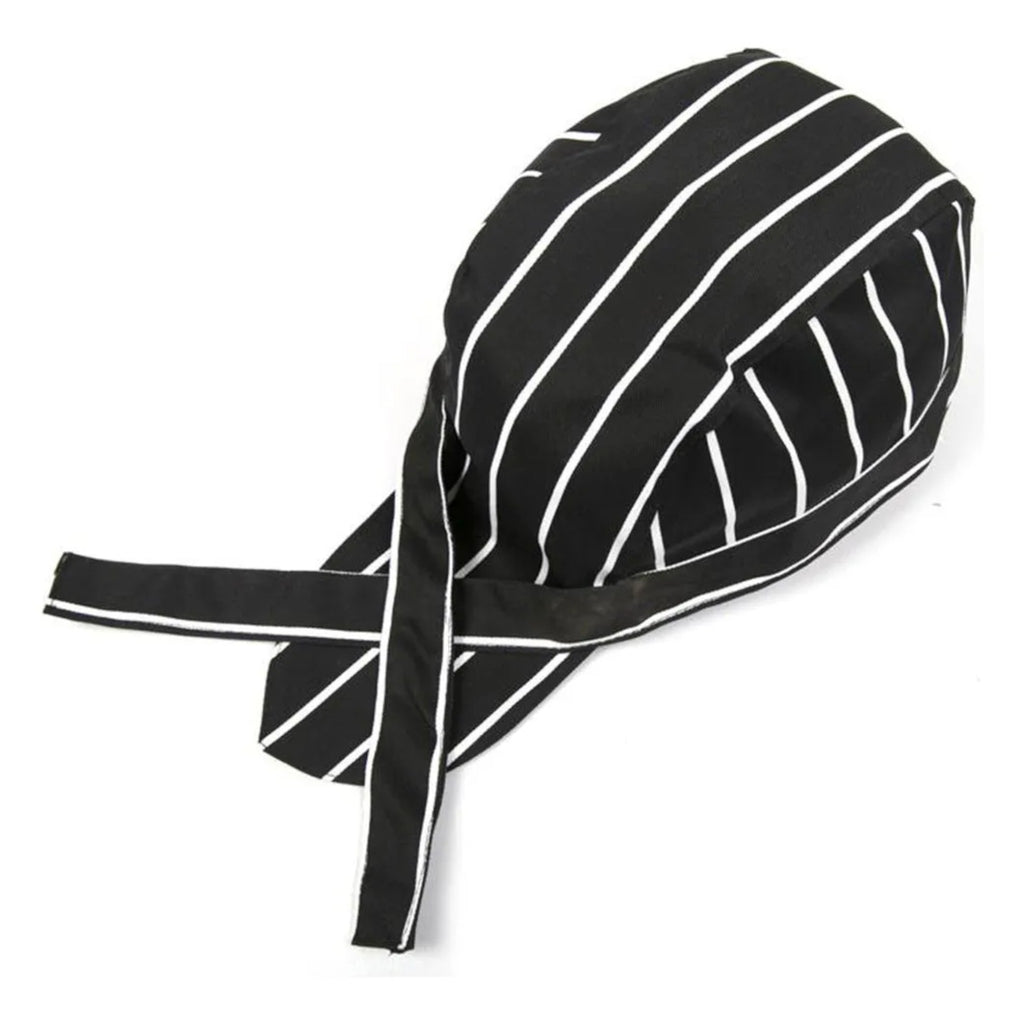 Bandana rayada en tonos negro y blanco, confeccionada en 65% poliéster y 35% algodón. Ideal para mantener el cabello recogido y aportar un toque moderno al uniforme de cocina. Cómoda, ligera y fácil de ajustar, perfecta para largas jornadas culinarias.