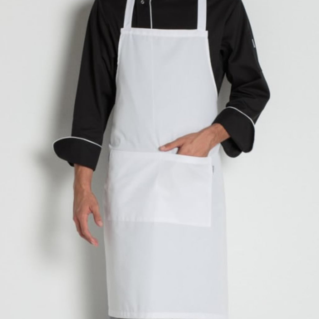 Pechera blanca victory multimenaje fabricada en 65% poliester - 35% algodón, diseñada para proteger la ropa durante la preparación de alimentos. resistente y fácil de limpiar, ofrece ajuste cómodo y cobertura completa. perfecta para uso profesional en cocina.