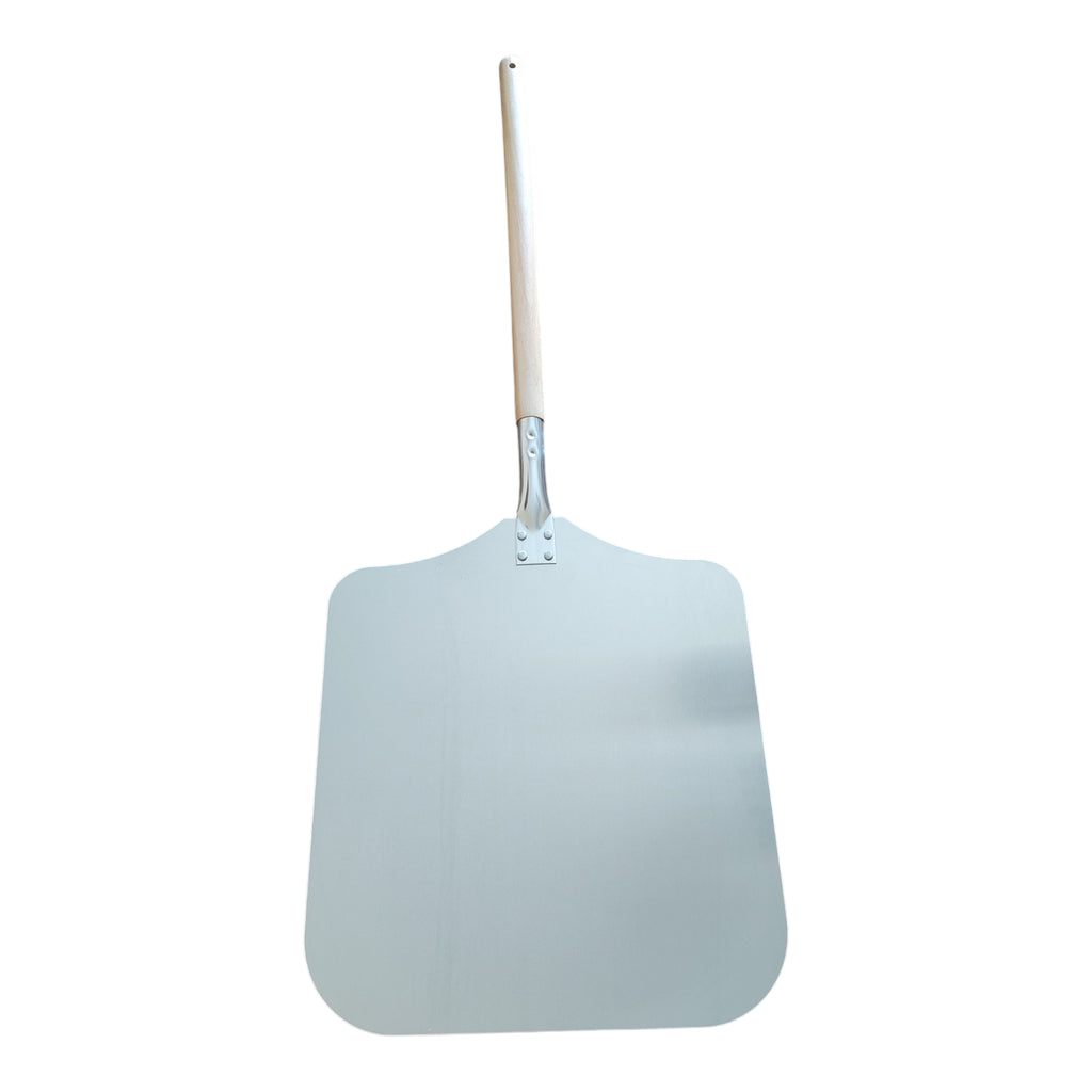 Pala de pizza en aluminio con mango de madera, medidas aproximadas de 35x96 cm. Diseñada para introducir y retirar pizzas con facilidad. Su estructura liviana permite maniobras precisas, mientras el mango de madera ofrece aislamiento térmico. Ideal para hornos profesionales.