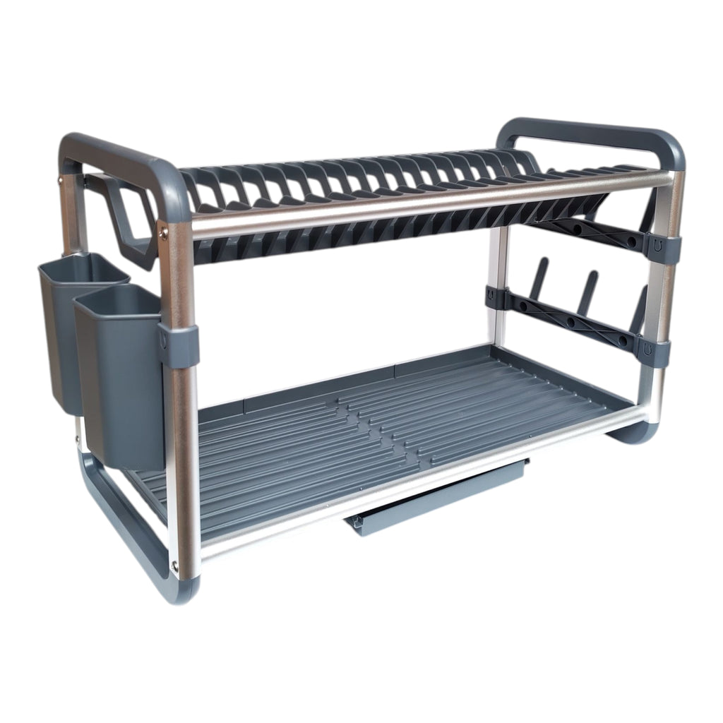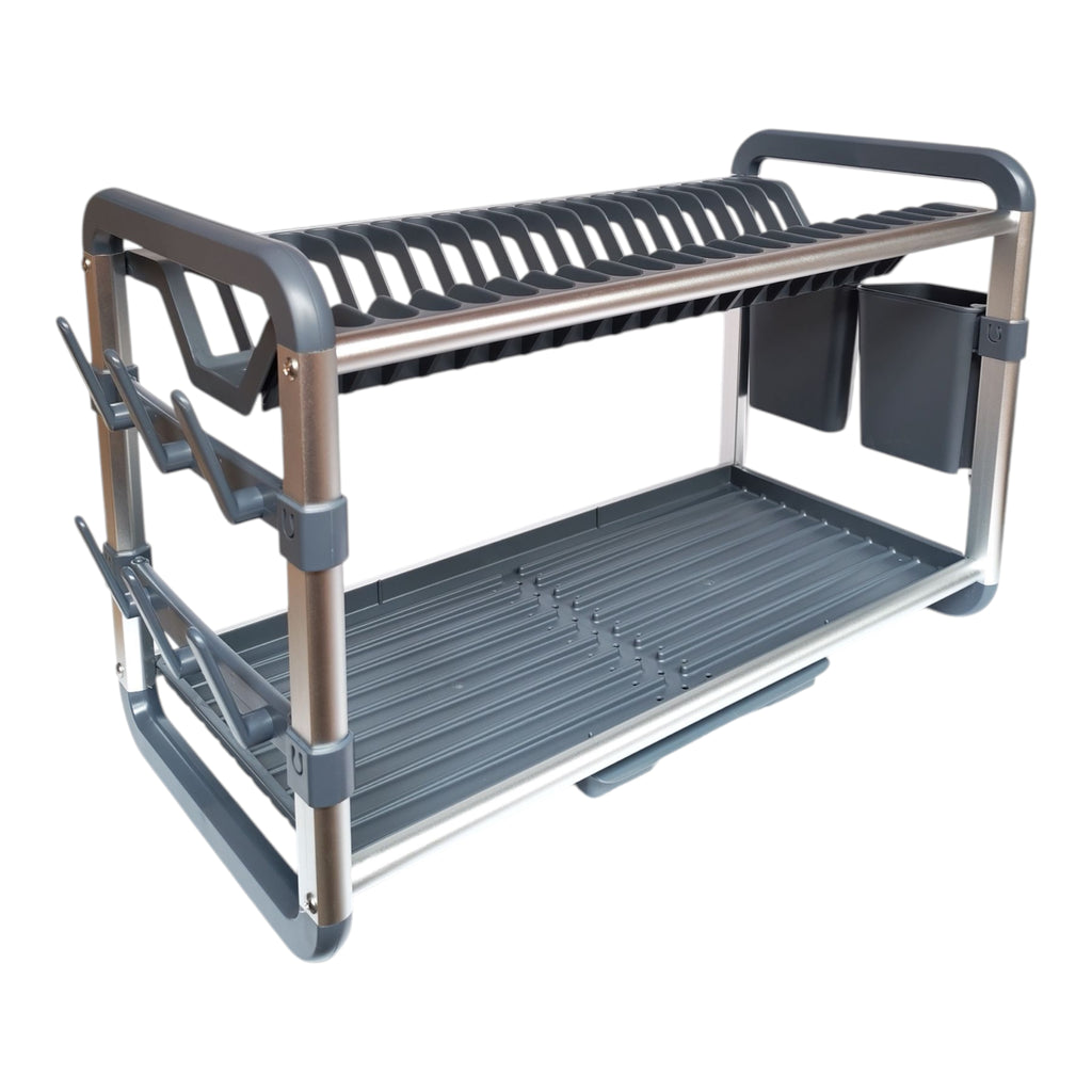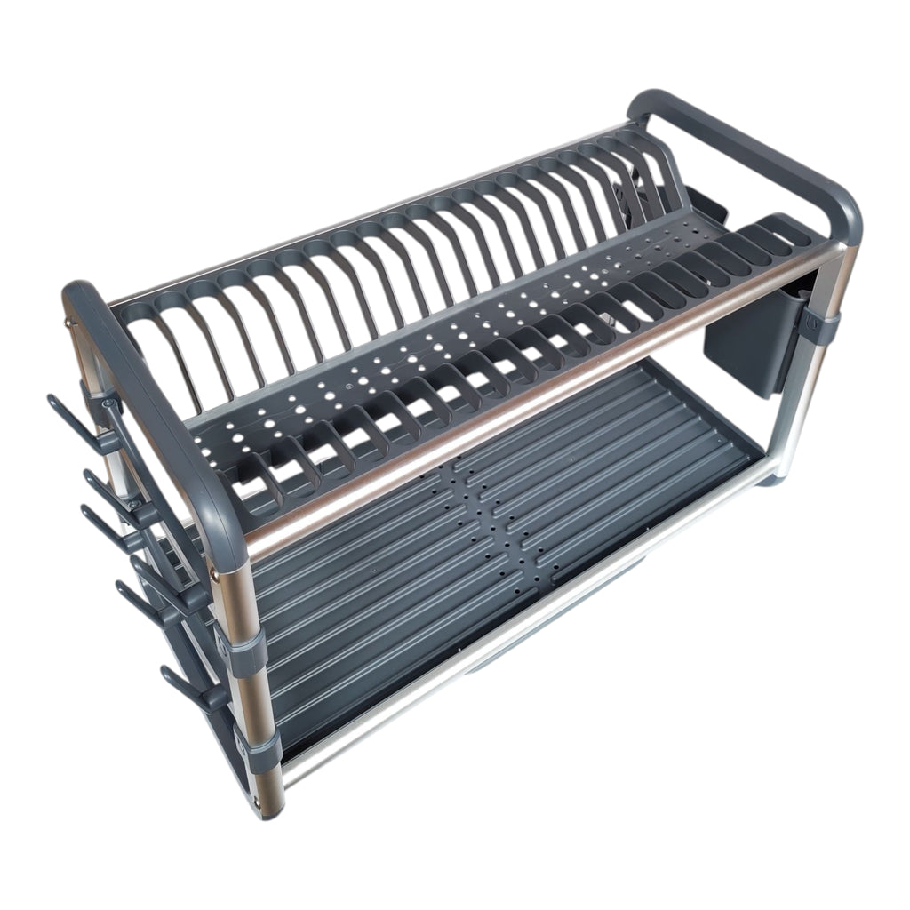 Seca platos de aluminio de dos pisos (61 x 27 cm aprox.), diseñado para maximizar el espacio en la cocina. Su estructura liviana y resistente soporta platos, vasos y cubiertos. El aluminio evita corrosión y facilita la limpieza. Incluye bandejas y compartimentos funcionales para mantener el orden tras cada lavado.
