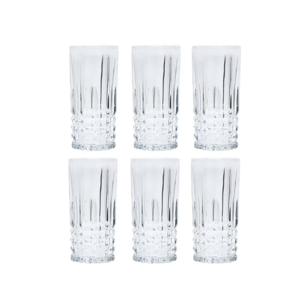 Vaso alto Rollins de vidrio, capacidad de 380 ml. Perfecto para refrescos, agua o tragos largos. Diseño elegante y funcional.