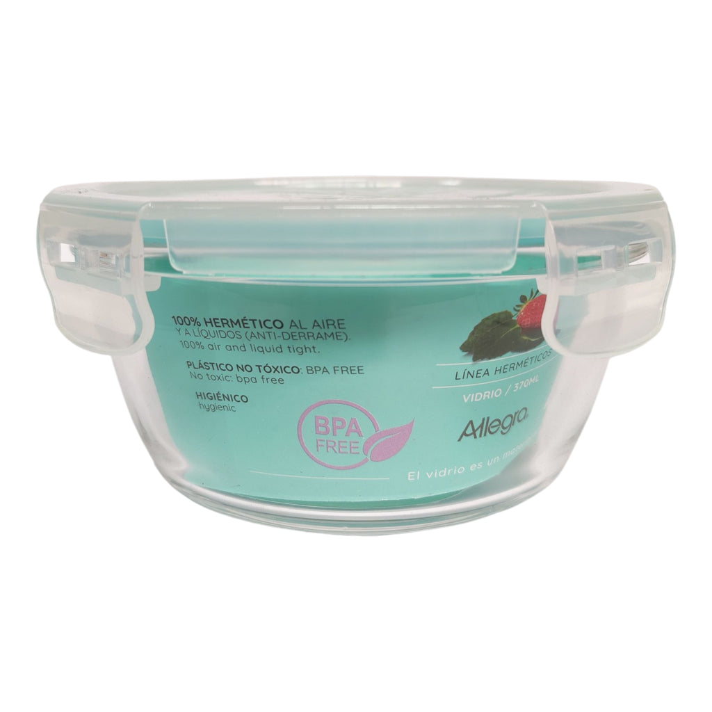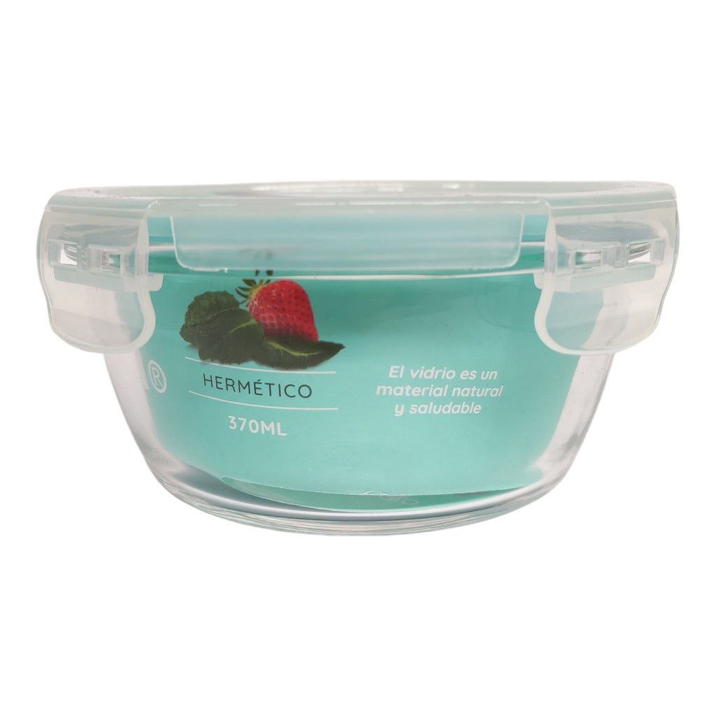 Contenedor redondo de vidrio de 370 cc con tapa hermética de cierre seguro. Ideal para guardar porciones individuales o snacks. Fabricado en vidrio resistente a altas temperaturas, apto para microondas, horno y lavavajillas. Mantiene los alimentos frescos por más tiempo y evita olores indeseados.